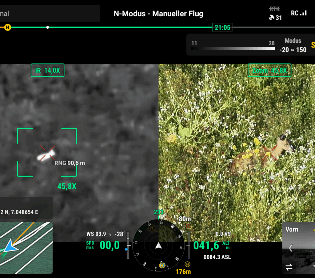 Vor der Mahd fliegen wir Felder mit Wärmebilddrohnen ab, um Rehkitze aufzuspüren, die sich im hohen Gras verstecken. So retten wir Tierleben und verhindern tödliche Kollisionen mit Mähwerken.